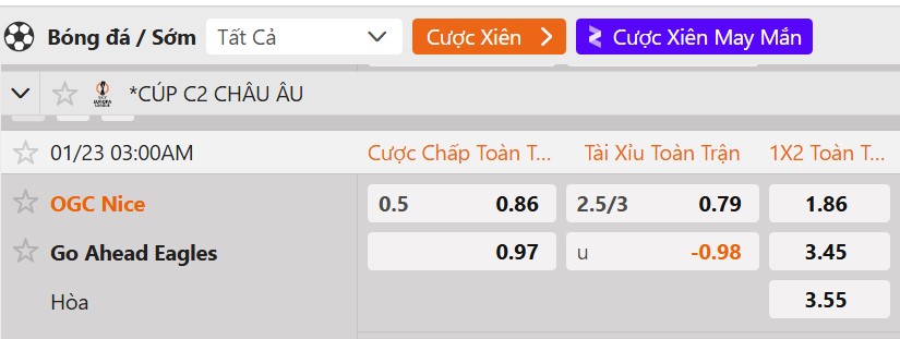 Tỷ lệ kèo Nice vs Go Ahead Eagles