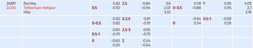 Tỷ lệ kèo Premier League Burnley vs Tottenham