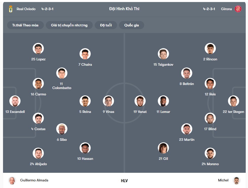 Cụ thể, Oviedo đã trải qua chuỗi 8 trận liên tiếp không biết đến mùi chiến thắng trên sân nhà, một thống kê phản ánh rõ sự bất ổn cả về lối chơi lẫn tâm lý thi đấu. Trong khi đó, Girona lại thể hiện bộ mặt tích cực mỗi khi phải hành quân xa nhà. Đội bóng của HLV Michel vừa chấm dứt chuỗi 5 trận sân khách không thắng bằng việc giành trọn vẹn 3 điểm trong cả 3 chuyến làm khách gần nhất, lần lượt trước những đối thủ không hề dễ chịu như Real Sociedad, Espanyol và Mallorca. Thành tích này cho thấy Girona đang có sự tự tin lớn khi thi đấu xa Montilivi, và đó là cơ sở để tin rằng họ đủ khả năng giành trọn 3 điểm ở chuyến làm khách tới đây. Về mặt lực lượng, Oviedo nhiều khả năng sẽ không có sự phục vụ của Eric Bailly và Ovie Ejaria do những vấn đề liên quan đến chấn thương. Phía bên kia chiến tuyến, Girona cũng đang phải đối mặt với cơn bão chấn thương khi Juan Carlos, Donny van de Beek, Portu và Cristhian Stuani đều chưa thể trở lại thi đấu. Ngoài ra, Abel Ruiz và Axel Witsel vẫn cần được kiểm tra thêm về tình trạng thể lực trước khi HLV Michel đưa ra quyết định cuối cùng về khả năng ra sân.