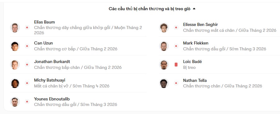 Về mặt lực lượng, Frankfurt không có sự phục vụ của tiền đạo Michy Batshuayi và Jonathan Burkardt do chấn thương, trong khi Can Uzun đang gặp vấn đề ở vùng đùi và khả năng ra sân còn bỏ ngỏ. Tân binh Arnaud Kalimuendo-Muinga, người gia nhập Frankfurt theo dạng cho mượn từ Nottingham Forest trong kỳ chuyển nhượng tháng Giêng, được kỳ vọng sẽ đá chính trên hàng công cùng Ritsu Doan và Fares Chaibi. Ở tuyến giữa, những đường chuyền và khả năng điều tiết lối chơi của Hugo Larsson có thể đóng vai trò then chốt. Tuy nhiên, bộ ba hậu vệ gồm Nnamdi Collins, Robin Koch và Arthur Theate sẽ cần cải thiện đáng kể khả năng phòng ngự nếu Frankfurt muốn nghĩ đến một kết quả tích cực. Bên phía Leverkusen, trung vệ Loic Bade sẽ vắng mặt do án treo giò, còn thủ môn Mark Flekken đang trong quá trình hồi phục chấn thương đầu gối và nhiều khả năng phải nghỉ thi đấu tới tháng Ba. Tiền vệ Robert Andrich có thể được kéo xuống đá ở hàng thủ trong sơ đồ ba trung vệ, sát cánh cùng Jarell Quansah và Jeanuel Belocian, án ngữ phía trước thủ môn Janis Blaswich.