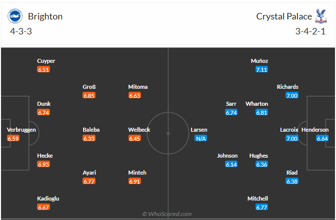 Brighton đã chơi tương đối thất vọng khi trình diễn một bộ mặt thi đấu nhạt nhoà ở vòng đấu vừa qua khi tiếp đón Everton trên sân nhà Amex Stadium. Đoàn quân của HLV Fabian Hurzeler đã chơi tốt hơn về mặt thế trận, nhưng sau cùng thì đội bóng này đã gây thất vọng khi chỉ kiếm về 1 điểm với trận hoà 1-1. Đối đầu với Crystal Palace đang thi đấu tệ hại ở giai đoạn vừa qua tại vòng 25 Premier League này mang tới thời cơ tốt để Brighton có thể mang về 3 điểm trọn vẹn, nhất là khi còn có lợi thế sân nhà và họ cần phải nỗ lực để có thắng lợi bằng mọi giá.
