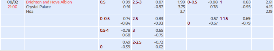 Brighton thể hiện tương đối thất vọng ở giai đoạn vừa qua khi đội bóng này đã không thắng ở 4/5 trận gần đây, trong đó có 3 trận hoà. Điểm đáng chú ý là dội bóng này dù bất bại cả 5 trận sân nhà gần nhất, nhưng trong đó có tới 4 kết quả hoà. Trong khi đó, Crystal Palace đã chơi vô cùng tệ khi họ đang có chuỗi 10 trận liên tiếp không thắng ở mọi đấu trường. Trong 5 lần chạm trán nhau trước đó giữa hai đội thì Crystal Palace có 2 thắng lợi, còn lại là 2 trận hoà và để thua 1 trận. Tuy nhiên, theo phong độ hiện tại, với tỷ lệ bóng đá 0,5 trái thì người chơi nên tin tưởng vào Brighton trận này.