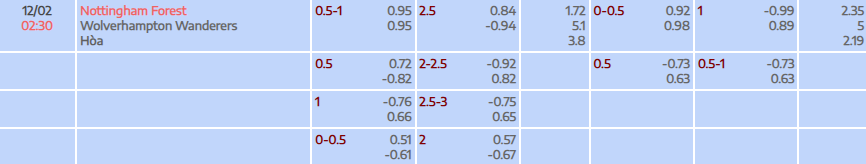 Tỷ lệ kèo Premier League Nottingham Forest vs Wolves