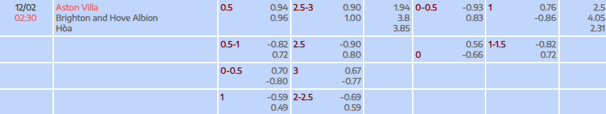 Tỷ lệ kèo Premier League Aston Villa vs Brighton