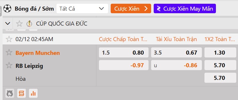 Tỷ lệ kèo Bayern Munich vs RB Leipzig