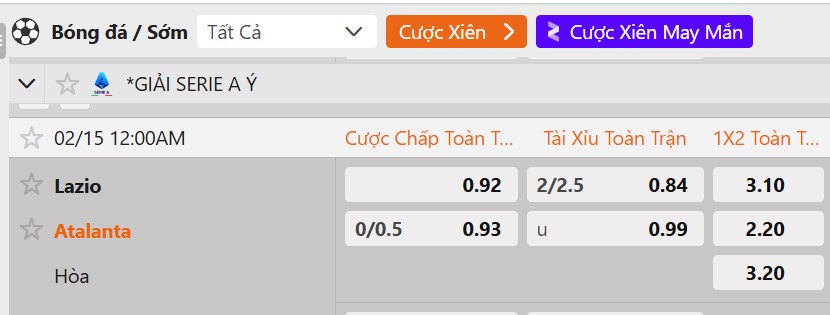 Tỷ lệ kèo SS Lazio vs Atalanta
