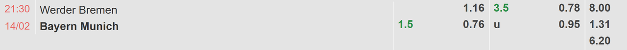 Đối đầu với một Werder Bremen đang khủng hoảng ở vị trí thứ 16, Bayern Munich nắm giữ mọi lợi thế để giành trọn 3 điểm và giúp nhà đầu tư giành chiến thắng khi tỉ lệ cược 1.5 FT được niêm yết. Trong 8 lần chạm trán gần nhất giữa hai đội, Bayern Munich đã giành tới 7 chiến thắng, bao gồm màn vùi dập 4-0 ở lượt đi vào tháng 9/2025. Với hiệu suất ghi 11 bàn và chỉ lọt lưới 4 lần trong 4 trận gần nhất trên mọi đấu trường, đoàn quân của Kompany đang tràn đầy tự tin để kéo dài mạch thăng hoa, đồng thời tạo đà tâm lý thuận lợi trước trận thư hùng quan trọng với Dortmund vào cuối tháng 2. Về mặt tài xỉu, trận đấu được niêm yết mức kèo 3.5 FT và trận đấu vẫn rất hứa hẹn nổ tài khi Bayern Munich chính là CLB có hiệu suất ghi bàn cực kỳ ấn tượng tại Bundesliga, trong khi đó 3 lần gần nhất chạm trán Werder Bremen, Bayern Munich đã ghi tới 12 bàn và giữ sạch lưới hoàn toàn.