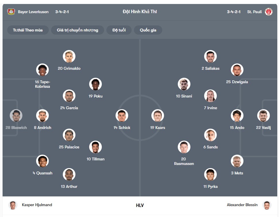 Ở phía đối diện, St Pauli cũng bước vào trận này với áp lực không nhỏ. Đội bóng hiện nằm trong nhóm cầm đèn đỏ và còn kém vị trí an toàn 2 điểm. Vì vậy, mỗi trận đấu với họ lúc này đều mang tính chất sống còn trong cuộc chiến trụ hạng. Tại vòng đấu gần nhất, St Pauli đã gây bất ngờ lớn khi đánh bại VfB Stuttgart với tỷ số 2-1. Đây là đội bóng đang xếp thứ 5 trên bảng xếp hạng, nên chiến thắng đó cho thấy St Pauli hoàn toàn có khả năng tạo nên cú sốc trước các đối thủ mạnh hơn. Kết quả này chắc chắn khiến Leverkusen phải thận trọng hơn.