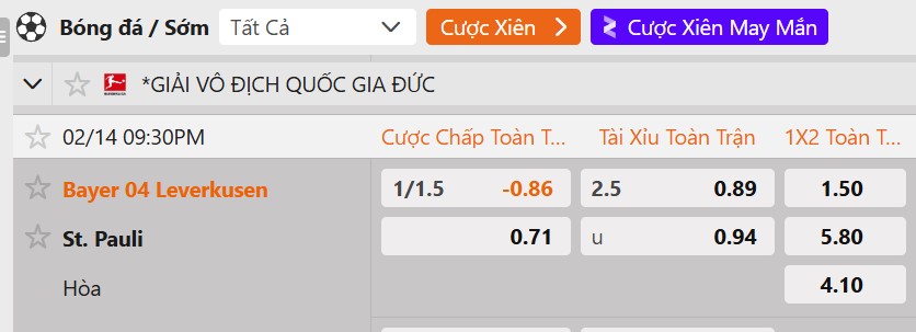 Tỷ lệ kèo Bayer Leverkusen vs St. Pauli