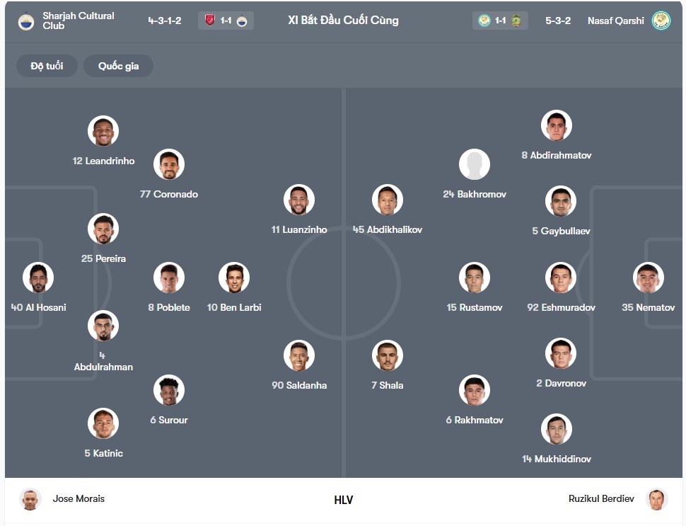 Về phía Nasaf, phong độ gần đây còn đáng lo hơn. Trong 14 trận gần nhất, đại diện Uzbekistan chỉ có đúng 1 chiến thắng, hòa 4 trận và thua tới 9 trận. Đáng nói hơn, Nasaf để thua với cách biệt từ 2 bàn trở lên ở 3 trận, bao gồm thất bại 1-6 trước Yenisey, 1-6 trước Zwickau và 0-2 trước Mashal Muborak. Ngoài ra còn trận thua 2-3 trước Radnicki 1923, dù chỉ cách biệt 1 bàn nhưng vẫn cho thấy hàng thủ mong manh. So với Al-Sharjah, Nasaf có ít trận thắng đậm hơn hẳn, thậm chí không có chiến thắng nào với cách biệt 2 bàn trở lên trong chuỗi trận này. Điều đó cho thấy khả năng bứt phá của họ đang rất hạn chế. Xét riêng khả năng ghi bàn và để thủng lưới, Al-Sharjah trong 14 trận đã ghi tổng cộng 23 bàn, trung bình khoảng 1,64 bàn mỗi lần ra sân. Tuy nhiên, họ cũng để lọt lưới 25 bàn, tức trung bình 1,79 bàn thua mỗi lần ra sân. Điều này lý giải vì sao có nhiều trận đấu của Al-Sharjah rơi vào kịch bản bùng nổ bàn thắng. Thực tế, có tới 8/14 trận của họ khép lại với từ 3 bàn trở lên, điển hình như các trận 4-2, 3-2, 3-1 hay 1-4. Ngược lại, chỉ 4 trận kết thúc với tối đa 2 bàn, bao gồm các tỷ số 1-0, 0-1 hoặc 1-1. Như vậy, xu hướng chung trong các trận của Al-Sharjah là cởi mở và có nhiều bàn thắng.