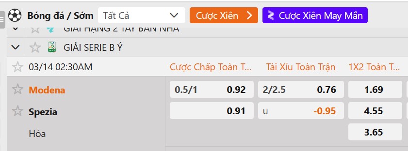Tỷ lệ kèo Modena vs Spezia