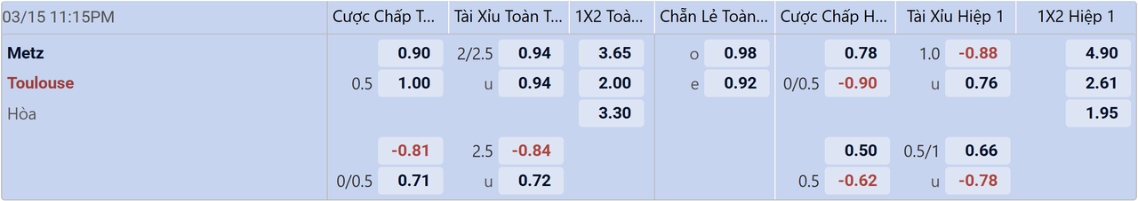 Toulouse đang được trao cơ hội thuận lợi để khép lại màn trình diễn bết bát trong hơn 1 tháng qua với sự xuất hiện của đội bét bảng Metz. Trước một câu lạc bộ yếu ớt như thầy trò Benoit Tavenot, cửa thắng kèo châu Á trở nên rộng mở dành cho các vị khách dù có phải chấp 0.5 FT. Điều này cũng được thể hiện rõ ràng thông qua lịch sử đối đầu trực tiếp giữa hai câu lạc bộ với sự áp đảo của thầy trò Carles Martinez. Cụ thể, Toulouse toàn thắng cả 3 cuộc gặp gỡ gần nhất và lượt đi họ vượt qua Metz bằng chiến thắng 4 sao ngay tại tổ ấm.