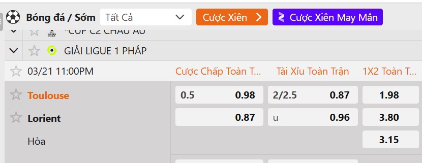 Tỷ lệ kèo Toulouse vs Lorient