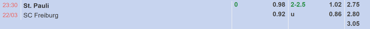 Với sự cải thiện về mặt phong độ của Pauli và lợi thế sân bãi, nhà cái xếp chủ nhà đứng ngang hàng với Freiburg thông qua tỷ lệ đồng banh. Thế nhưng, mức kèo này khiến cánh cửa giành chiến thắng trên sân chơi handicap của thầy trò Alexander Blessin như dần đóng lại. Kết quả thắng 6/26 vòng tại Bundesliga 2025/26 như một cơ sở quá rõ ràng để từ chối chủ sân Millerntor-Stadion. Chưa dừng lại ở đó, Pauli còn có 2 lần gặp nhau liên tiếp trước Freiburg đều ngã ngựa. Vượt trội từ thành tích thi đấu mùa này lẫn lịch sử đối đầu, Freiburg là lựa chọn hoàn hảo để giới mộ điệu xuống tiền, bất chấp 3 vòng đấu gần nhất không thắng.