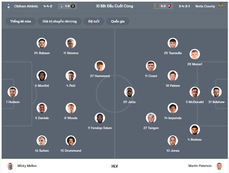 Ở vòng đấu này, Notts County sẽ phải đối mặt với một thử thách không hề dễ dàng mang tên Oldham. So với đối thủ, Oldham hiện đang xếp thứ 11 với 58 điểm và vẫn còn nguyên cơ hội cạnh tranh một vị trí trong nhóm dự play-off. Khoảng cách giữa Oldham và đội đứng thứ 7 là Grimsby chỉ là 4 điểm, vì vậy động lực thi đấu của họ là rất rõ ràng khi mùa giải đang bước vào giai đoạn nước rút. Dựa trên những dữ liệu thể hiện trong hai bảng thống kê về phong độ gần đây, có thể nhận thấy Oldham đang thể hiện một bộ mặt rất tích cực mỗi khi được chơi trên sân nhà. Trong khoảng hơn 10 trận tiếp đón các đối thủ gần đây, Oldham giành được tới 7 chiến thắng, hòa 3 và chỉ để thua đúng 2 trận. Thành tích này cho thấy họ đang biến sân nhà trở thành điểm tựa cực kỳ vững chắc. Đáng chú ý, phần lớn những chiến thắng của Oldham đều đến với thế trận khá chắc chắn, khi họ không chỉ biết cách ghi bàn mà còn duy trì được sự tập trung nơi hàng thủ.