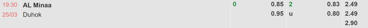 Bất chấp sự chững lại của Duhok, họ vẫn sở hữu một đẳng cấp áp đảo hơn chủ nhà Al Minaa trước giờ tái đấu. Cả hai lần gặp nhau gần nhất, thầy trò Abdul-Ghani Shahad đều dễ dàng bỏ túi 3 điểm mà không phải nhận bất kỳ bàn thua nào. Phong độ có phần thiếu ổn định, nhưng Duhok chắc chắn sẽ không làm các nhà đầu tư phải thất vọng trước một Al Minaa kém cỏi hơn hẳn. Lợi thế sân bãi của Al Minaa chẳng đáng nhắc đến, bởi đoàn quân của HLV Hussein Abdul-Wahid có tới 7/8 trận gần nhất được thi đấu tại tổ ấm không thể ca khúc khải hoàn.
