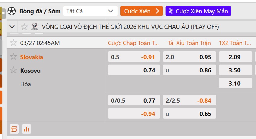 Tỷ lệ kèo Slovakia vs Kosovo