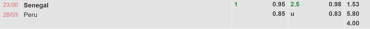 Peru là đối thủ quá phù hợp để làm quân xanh phục vụ cho trận đấu mang tính chất chiến lược và tìm lại sự ăn ý của toàn đội Senegal. So sánh về đẳng cấp, một đội tuyển không thể đại diện Nam Mỹ tham dự vòng chung kết World Cup 2026 như Peru không có cửa để đánh bại Sư Tử Teranga. Thậm chí, thầy trò Oscar Manuel nên chuẩn bị tinh thần nhận thất bại nặng nề trong chào sân đầu tiên của 2026 dù chỉ mang tính chất đá giao hữu. Quá khứ từng ghi nhận, Peru thắng Senegal vào 2011, nhưng thực lực hiện tại của hai đội tuyển chênh lệch quá lớn. Điều này khiến mức kèo 1.0 FT nghiêng về phía Senegal không phải trở ngại quá lớn để đại diện châu Phi giúp người chơi thắng cược.