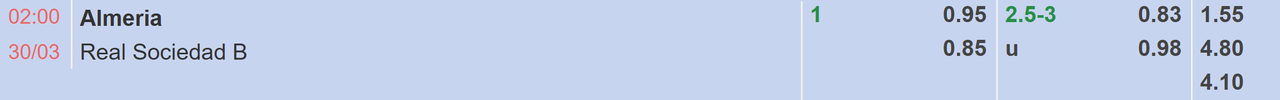 Real Sociedad B chưa từng thắng Almeria trong quá khứ và đó chính là hạn chế của thầy trò Ion Ansotegi ở vòng 32, La Liga 2. Ở 3 lần chạm trán ít ỏi của hai câu lạc bộ, các vị khách thất thủ tới 2 trận và lượt đi mùa này hai bên chia điểm với tỷ số 2-2. Nhưng cuộc tái đấu sắp tới sẽ hoàn toàn khác biệt, Almeria trở về mái ấm và chính sân nhà đã giúp thầy trò Rubi sở hữu chuỗi 4 trận đón khách toàn thắng. Ngay cả nhà cái cũng nghiêng hẳn về phía Almeria với tỷ lệ chấp 1.0 FT và rõ ràng cửa trên nắm nhiều cơ hội vượt ải handicap thành công.