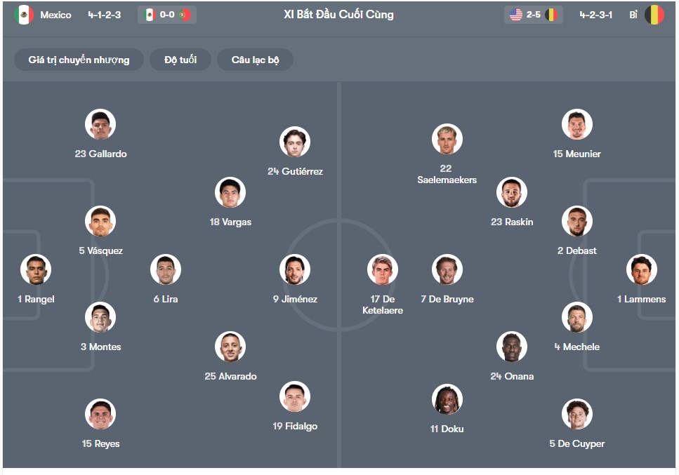 Về lực lượng, Mexico sẽ không có đội trưởng Edson Alvarez do chấn thương đầu gối từ tháng 2, trong khi Bỉ thiếu vắng Leandro Trossard. HLV Bỉ có thể sử dụng bộ ba tấn công gồm Jeremy Doku, Kevin De Bruyne và Alexis Saelemaekers phía sau tiền đạo cắm Charles De Ketelaere. Xét về số liệu bàn thắng, 5 trận gần nhất của Mexico có tổng cộng 9 bàn (trung bình 1,8 bàn/trận), trong khi Bỉ có 22 bàn (trung bình 4,4 bàn/trận). Với khả năng Mexico sẽ chơi tấn công nhiều hơn, cùng với việc hàng thủ của Bỉ không quá chắc chắn, trận đấu có thể chứng kiến việc cả hai đội cùng ghi bàn. Trong lần đối đầu gần nhất, hai đội đã tạo ra tới 6 bàn thắng. Ngoài ra, các thống kê khác cũng đáng chú ý: nhiều trận gần đây của cả hai đội kết thúc với tỷ số chẵn; số thẻ vàng thường không vượt quá 3; và hiệp 1 thường có ít bàn thắng. Tóm lại, cả Mexico và Bỉ đều đang có chuỗi trận không thua kéo dài. Với sự chênh lệch không quá lớn về thực lực, nhiều khả năng hai đội sẽ tiếp tục duy trì thành tích này sau cuộc đối đầu sắp tới.