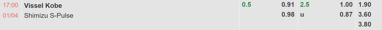 Dựa vào hiệu suất ghi bàn ổn định và khả năng phòng ngự không quá chặt chẽ của Vissel Kobe vs Shimizu, tài 2.5 FT mang lại nhiều cơ hội chiến thắng ở sân chơi tài xỉu. Chủ nhà đứng đầu bảng tổng sắp với 14 lần nổ súng nhưng cũng phải nhận 9 bàn thua trong 8 vòng đã đấu. Cùng lúc đó, Shimizu điền tên lên bảng điện tử 11 lần và có 10 tình huống thủng lưới mùa này. Cộng thêm 3/4 màn đọ sức mới nhất của Vissel Kobe vs Shimizu có số pha lập công từ 3 bàn trở lên, 90 phút sắp tới được dự đoán đầy hấp dẫn với phong cách thi đấu cởi mở của hàng công đôi bên.