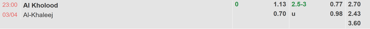 Kể từ năm 2025 đến nay, Al Kholood và Al Khaleej đã có 3 lần chạm trán ở các sân chơi trong nước, tuy nhiên Al Khaleej chưa một lần cầm hòa đối thủ chứ chưa nói đến mang về chiến thắng. Với mức kèo đồng banh trong lần tái đấu sắp tới, Al Khaleej tỏ ra họ là một lựa chọn kém an toàn khi cả 3 lần chạm trán gần nhất với Al Kholood họ đều để thủng lưới ít nhất 2 bàn mỗi trận. Thực tế cả 3 cuộc đối đầu giữa họ đều gây ấn tượng với sự xuất hiện của rất nhiều bàn thắng, với tổng số 15 bàn thắng trung bình mỗi trận 5 bàn. Trong khi đó tỉ lệ kèo tài xỉu của trận đấu tới chỉ là 2.75 FT khiến nhà đầu tư có thể kỳ vọng vào một kết quả nổ tài. Nên nhớ, mặc dù mất khả năng cạnh tranh vào top đầu ở giải VĐQG nhưng Al Kholood cũng rất cần một chiến thắng để khích lệ tinh thần trước khi bước vào trận chung kết tại Cúp nhà vua Ả Rập Xê-út.