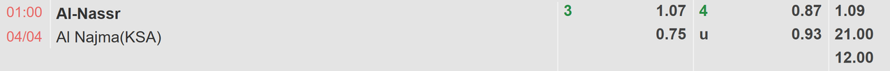 Cuộc đối đầu giữa 2 đội bóng đang nằm ở 2 đầu của bảng xếp hạng đã cho thấy phong độ yếu kém của Al Najma và sức mạnh hủy diệt của Cristiano Ronaldo và đồng đội tại giải VĐQG Ả Rập Xê-út mùa này. Một chiến thắng trước Al Najma có lẽ là không phải nhiệm vụ khó khăn với Al Nasser. Cần biết rằng, Al Nassr đang sở hữu phong độ tốt khi chạm trán Al Najma khi toàn thắng ở cả 5 lần gần nhất đối đầu, có tới 4 trận trong số đó khép lại khi Al Nassr giữ sạch lưới hoàn toàn và 4/5 trận kết thúc với chiến thắng khi họ không để lọt lưới bàn nào. Có thể nói phong độ và sức mạnh đối lập của 2 CLB khiến cho Al Nassr trở thành lựa chọn an toàn hơn với nhà đầu tư, tuy nhiên 4/5 trận gần nhất diễn ra trên sân nhà, Al Nassr đều giúp người chơi theo xỉu dành thắng lợi. Vì vậy, với việc trở về sân nhà trong trận đấu tại vòng 27, giải VĐQG Ả Rập Xê-út thì cửa xỉu ở mức kèo 4.0 FT là phương án sáng cho nhà đầu tư.