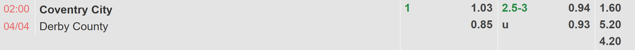 Trong trận đấu gần nhất trở về sân nhà, Coventry đã nhận thất bại với tỉ số 2-1 trước Southampton nhưng Derby County khó có thể một lần nữa hạ gục Coventry trong chuyến đi sắp tới khi phong độ sân khách của họ cũng không khả quan. Cụ thể Derby County đã thua tới 3 trận trong 4 chuyến đi xa nhà vừa qua, hơn nữa Coventry đang nỗ lực bảo vệ ngôi đầu bảng xếp hạng khiến nhiệm vụ có điểm của Derby County trong trận đấu tới là rất khó khăn. Với lợi thế sân bãi cùng thực lực nhỉnh hơn đối phương, Coventry có thể là lựa chọn an toàn hơn cho nhà đầu tư trong lần ra sân sắp tới. Kịch bản nhiều bàn thắng cũng rất đáng mong chờ khi lần gần nhất đôi bên so tài đã có tới 8 bàn thắng được ghi từ cả 2 bên, hiện tại họ đều là những đội bóng hàng đầu giải Hạng Nhất khiến NHM có thể kỳ vọng vào một trận đấu tưng bừng bàn thắng.