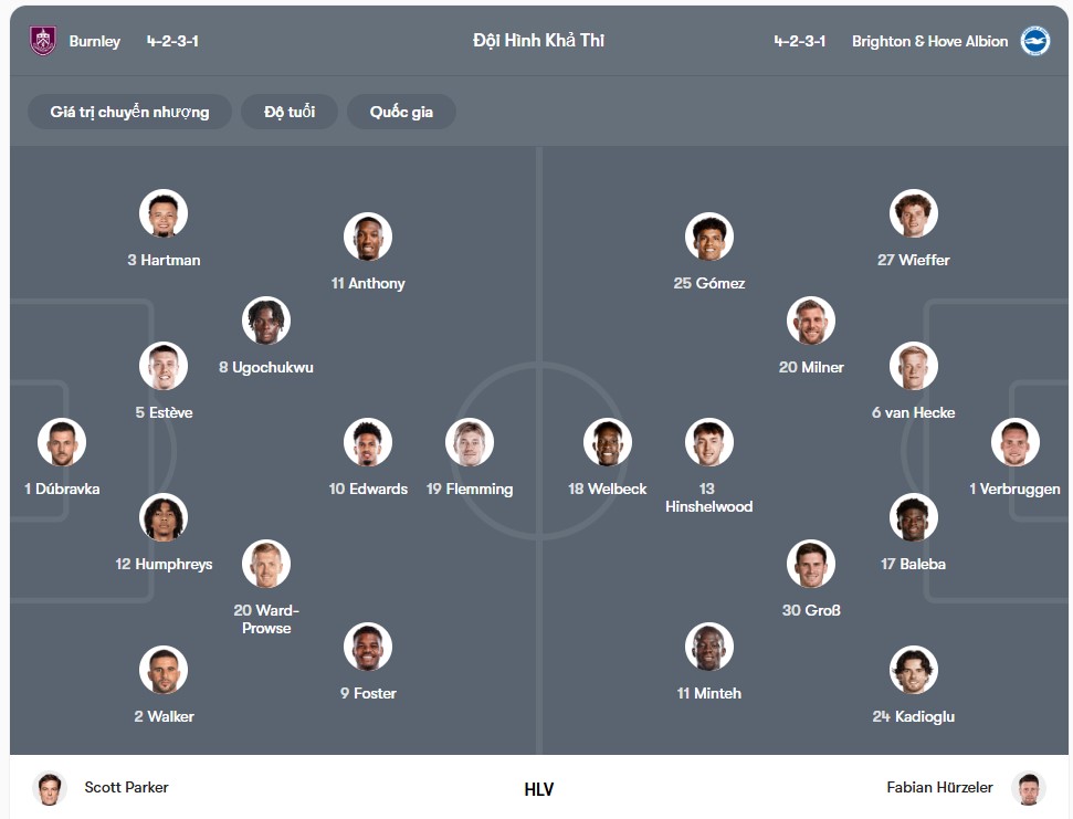 Dù phong độ sân khách của Brighton trong cả mùa giải chưa thực sự nổi bật, với chỉ 4 chiến thắng sau 15 trận, nhưng họ lại có thành tích khá tốt khi làm khách tại Turf Moor. Cụ thể, trong 4 lần gần nhất đến sân đấu này, Brighton đều bất bại với 2 chiến thắng và 2 trận hòa. Ở trận đấu sắp tới, họ đang hướng tới mục tiêu giành chiến thắng thứ 3 liên tiếp trên sân khách – điều mà họ chưa làm được kể từ tháng 1 năm 2023. Xét tổng thể, Burnley đang ở trong tình thế vô cùng khó khăn khi vừa phải chịu áp lực trụ hạng, vừa có phong độ yếu kém và hàng phòng ngự thiếu chắc chắn. Ngược lại, Brighton lại đang sở hữu phong độ cao, lối chơi rõ ràng và mục tiêu cụ thể trong cuộc đua giành vé dự cúp châu Âu. Nếu tiếp tục duy trì được sự hiệu quả trong cách triển khai pressing cũng như tận dụng tốt những sai lầm của đối phương, đội khách hoàn toàn có khả năng rời sân với trọn vẹn 3 điểm.