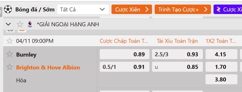 Tỷ lệ kèo Burnley vs Brighton