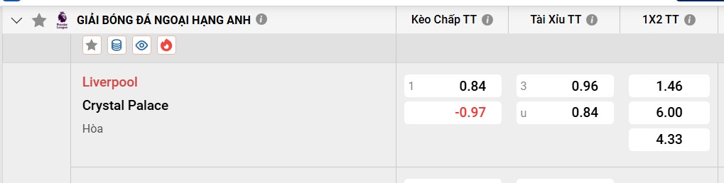 Tỷ lệ kèo Liverpool vs Crystal Palace