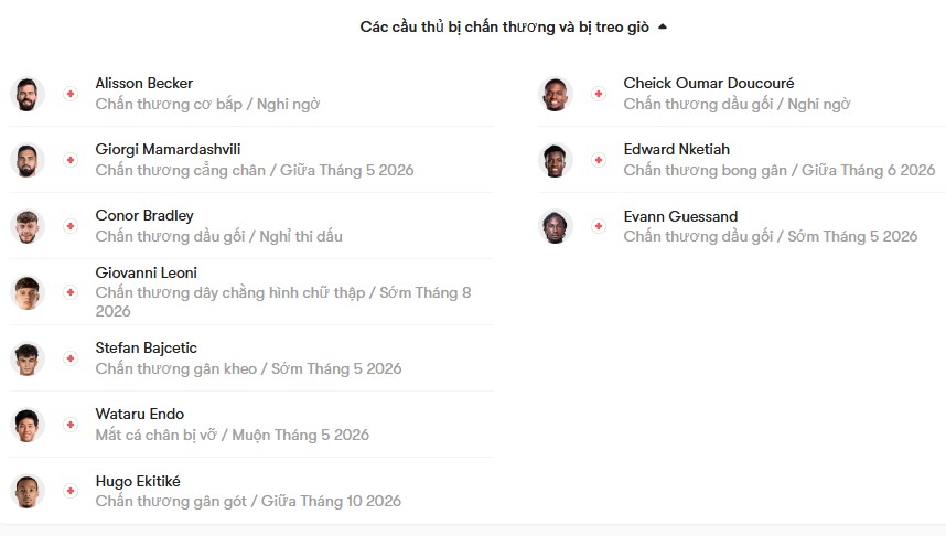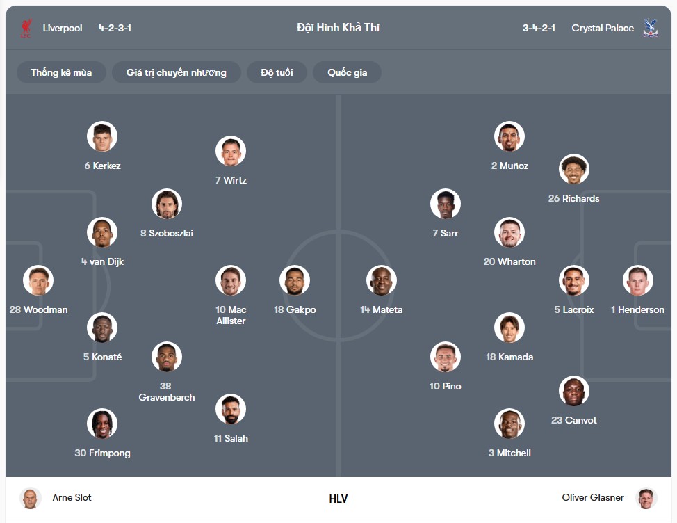 Dù không thể bảo vệ chức vô địch Premier League, Liverpool vẫn cho thấy sự ổn định đáng kể khi thi đấu tại Anfield. Trong 10 trận sân nhà gần nhất ở giải quốc nội, họ chỉ để thua duy nhất 1 trận, cho thấy đây vẫn là điểm tựa rất vững chắc. Ở phía đối diện, Crystal Palace không còn nhiều mục tiêu tại Premier League, nhưng họ vẫn còn tham vọng lớn ở đấu trường châu Âu. Chỉ vài ngày sau chuyến làm khách tại Anfield, thầy trò HLV Oliver Glasner sẽ hành quân đến Ba Lan để đối đầu Shakhtar Donetsk tại bán kết Conference League. Rõ ràng, đây mới là ưu tiên hàng đầu của họ trong giai đoạn cuối mùa.