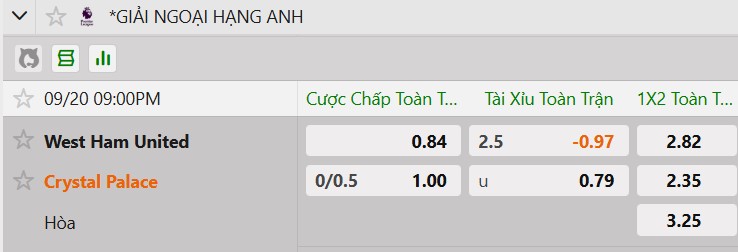 Tỷ lệ kèo West Ham vs Crystal Palace