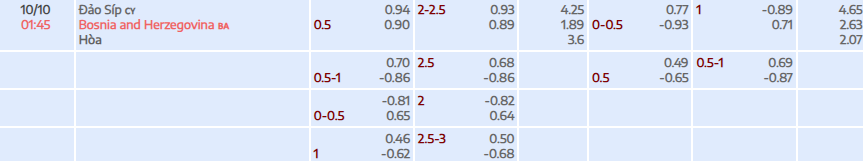 Phong độ trong giai đoạn vừa qua của Síp là khá kém cỏi khi đội bóng này không mang về cho mình trận thắng nào, còn lại là 2 trận hoà và 3 trận thua. Trong khi đó, Bosna và Hercegovina đã thể hiện chấp nhận được khi sở hữu 3 thắng lợi ở 5 trận đấu gần nhất trên mọi đấu trường, còn lại là việc đội bóng này đã phải nhận 2 thất bại. Trong 5 lần gần nhất đối đầu nhau giữa hai đội tuyển này thì Bosna và Hercegovina cũng đã chơi tốt hơn khi sở hữu 3 thắng lợi, còn lại là việc để thua 2 trận. Với tỷ lệ cá cược 0,5 trái thì các nhà đầu tư nên tin tưởng vào Bosna và Hercegovina ở cuộc đối đầu này để mang về cơ hội thắng kèo cao hơn.