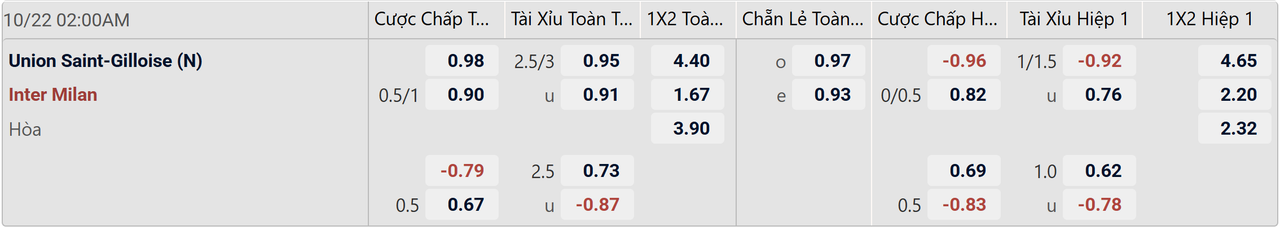 Union SG đối lập với Inter Milan với 5 lần thủng lưới trong khi đội khách lập công 5 bàn và vẫn giữ sạch lưới sau 2 vòng đấu. Màn trình diễn thượng hạng của Rắn Cỏ biến cửa tài mang tới nhiều tiềm năng thắng cược, vì nhà cái chỉ đưa ra tỷ lệ 2.75 FT. Nên nhớ, đại diện Serie A có tổng cộng 12 lần nổ súng trong 5 trận đấu gần đây ở mọi mặt trận. Cả hai kịch bản thắng lợi và thất bại của đại diện Bỉ cũng xuất hiện tài bàn thắng với 4 lần thay đổi bảng tỷ số.
