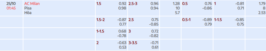 AC Milan cho thấy khả năng tận dụng khá ổn khi sơ hữu cho mình 10 pha lập công ở giai đoạn vừa qua, nhưng đặc biệt hơn là việc đoàn quân của HLV Massimiliano Allegri có một hàng phòng ngự vô cùng chắc chắn với việc có 3/5 trận giữ sạch lưới và chỉ để thủng lưới 2 lần. Trong khi đó, AC Pisa chỉ có được cho mình vỏn vẹn 2 bàn thắng sau 5 trận gần nhất, còn lại là việc hàng thủ nhận 8 bàn thua. AC Pisa cũng đã không thể ghi bàn ở 4/5 trận đấu gần nhất. Rất có thể đây sẽ là trận đấu mà AC Milan tạo ra được một thế trận áp đảo. Với tỷ lệ tài xỉu 2,75 trái thì người chơi nên tin tưởng vào khả năng nổ Tài trận này.